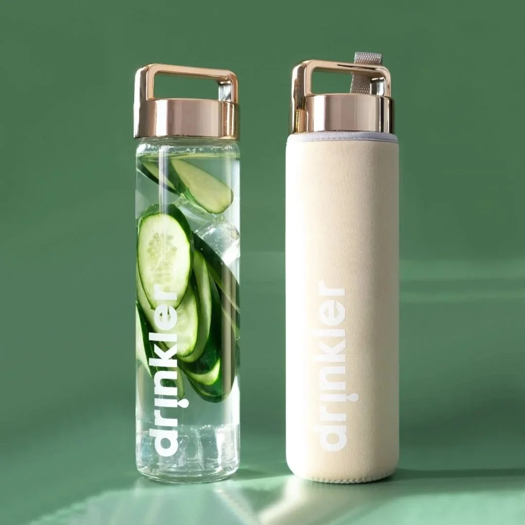 gratis glazen infused water bottle met beschermsleeve ter waarde van €29